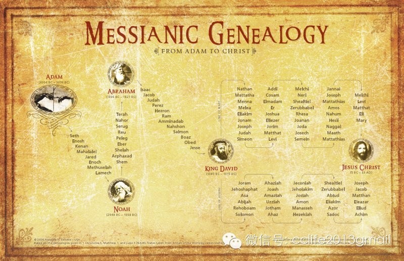 我们再看马太和路加所记载的两个不同的家谱。太1:1-17(参历代志上1:34,2:1-15,3:1-19),路3:23-38(参历代志上1:1-4,24-28,2:1-15,3:17,路得记4:8-22)马太写福音是为犹太人,所以就照律法从约瑟的方面写家谱,是自上而下,从亚伯拉罕起首直到耶稣基督,有三千年历史。路加写福音不是专为犹太人,乃是为普世的人,所以起头不写家谱,直到3:23-38才写出来。