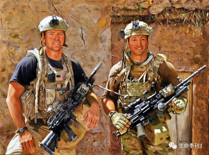后来福克斯电视台打电话给我,他们要我上他们的节目,我说可以,但是要有一个条件,就是不要把事件政治化。我只是想要在节目上记念泰。于是我带着泰的弟弟上节目,这里有一张他们的合照,你们知道哪个是泰,哪个是耶利米吗?泰就是那个提着来福枪的,他们兄弟俩都在海军服役。泰是在海豹突击队20年了。当泰去世后,耶利米马上打电话给海军,说我要顶替我哥哥的位置,我真为他感到骄傲!他在大学是拿体育奖学金的,所以成为海豹突击队员对他来说不会有太大问题。后来他们发现他是准医科学生,他们说你对我们更有价值了,只要你进了医学院我们马上跟你签12年合同。他现在是海军上尉,三月份他可以完成医学训练并进入军队了。为数不多的海豹突击队员可以成为医生,但通常不会反过来有医生成为海豹突击队员的。